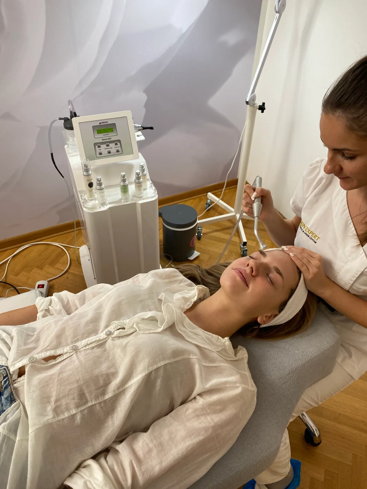 Professionelles Sauerstoff-Gesichtssystem: sterile Sauerstoffzufuhr, Serum-Infusion (Hyaluron, Vitamine), sanftes Sauerstoff-Peeling — Straffung, Hydration, Kollagen, beruhigende Haut.