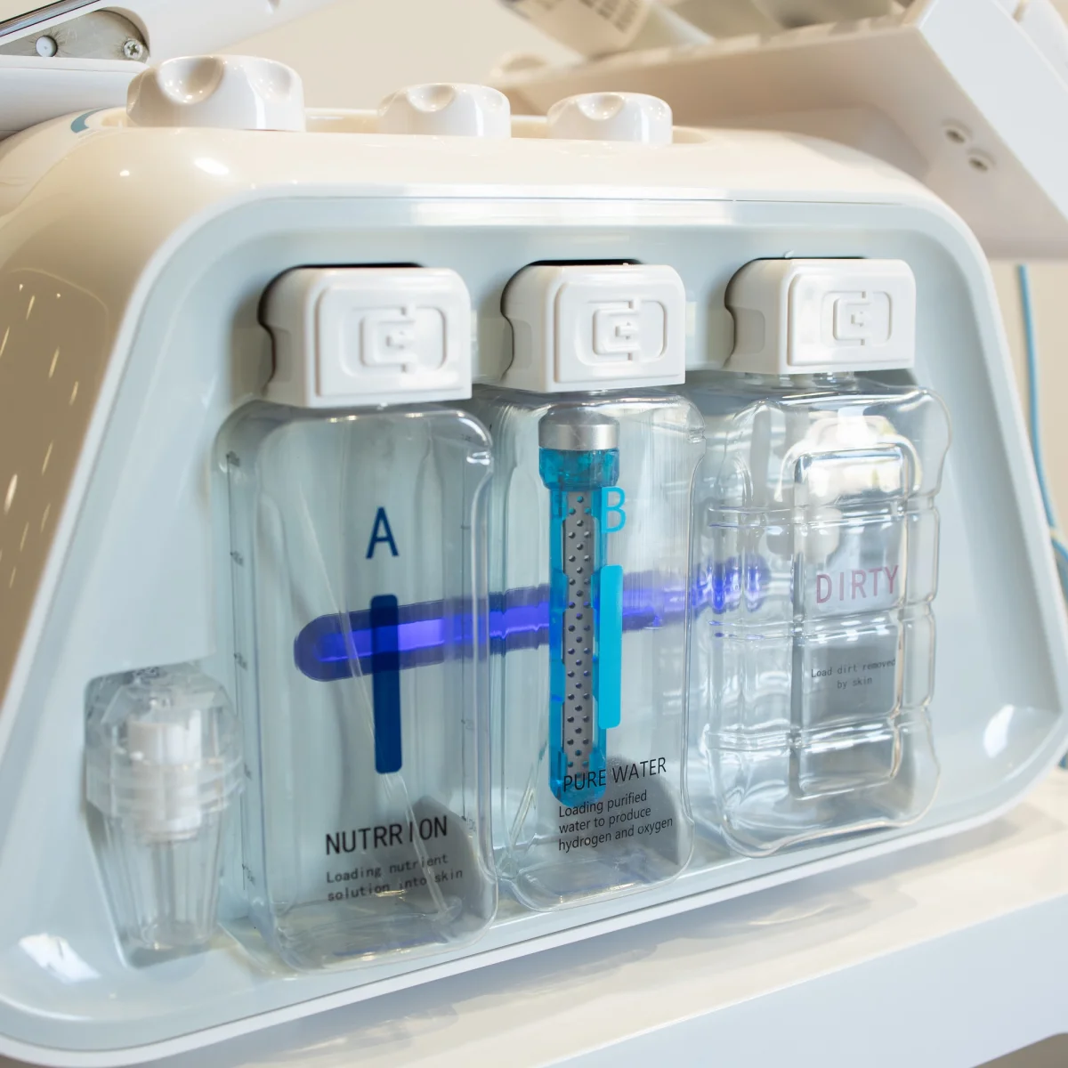 Hydrodermabrasion 6 Phasen: 360°-Silikon + Vakuum + BHA; Peel mit Antioxidantien; Hochdruck-Serum; Plasma-Ozon; bipolares RF Y; Datenblatt HydraClear 6 IN 1, 6028; Kühlung & Ultraschall laut zweitem Blatt.